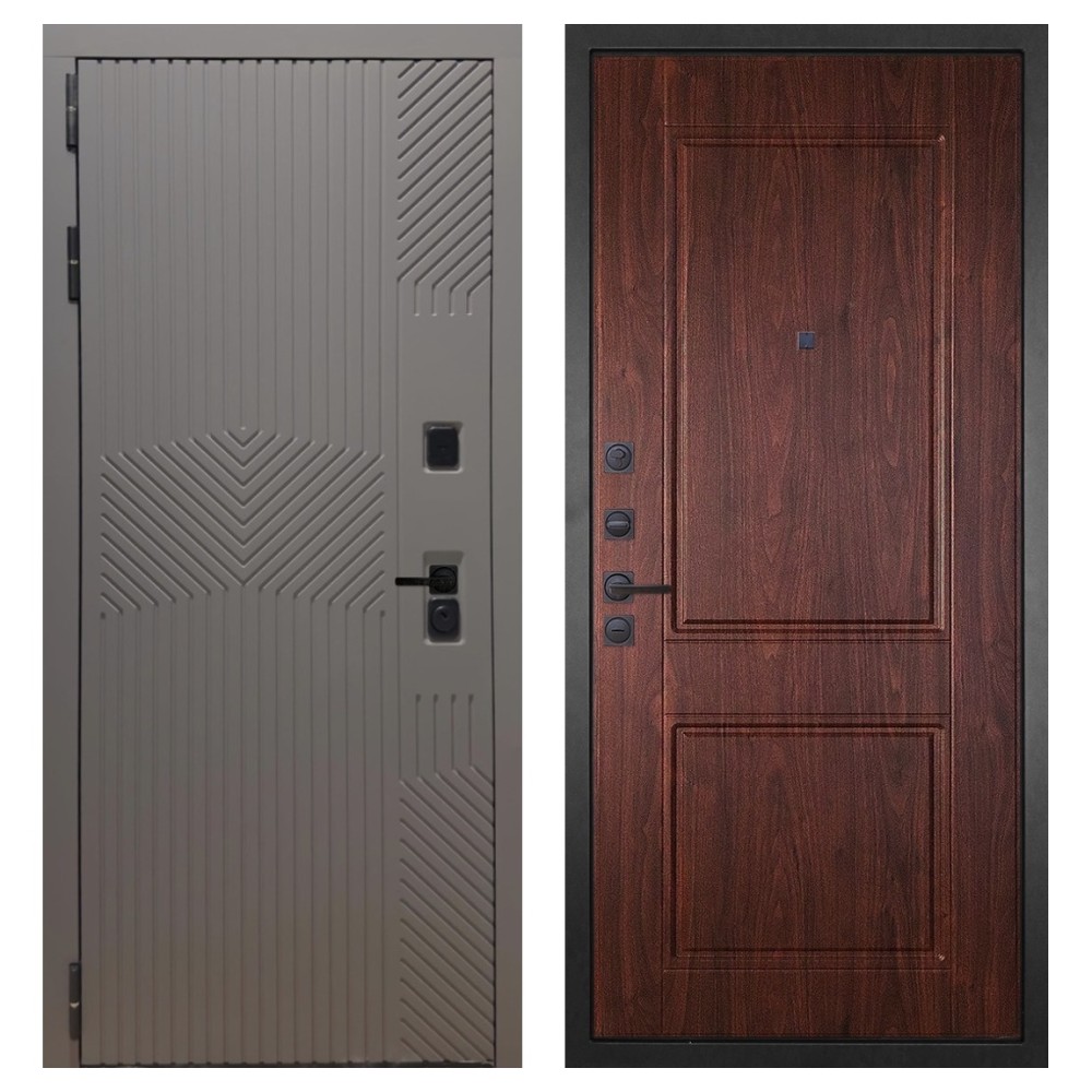 Дизайн и отделка: Металлическая конструкция окрашена полимерно-порошковым покрытием цвета «Муар чёрный». Внешняя МДФ-панель и наличники выполнены в цвете «Смоки софт» толщиной 10 мм — современное сочетание фактуры и оттенка, создающее стильный внешний вид. Чёрная фурнитура подчёркивает лаконичный характер модели.