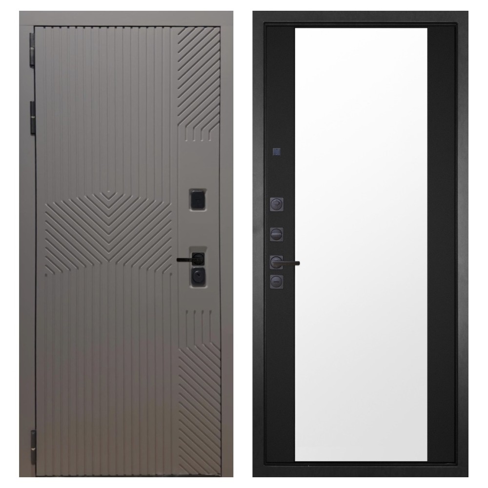 Дизайн и отделка: Металлическая конструкция окрашена полимерно-порошковым покрытием цвета «Муар чёрный». Внешняя МДФ-панель и наличники выполнены в цвете «Смоки софт» толщиной 10 мм — современное сочетание фактуры и оттенка, создающее стильный внешний вид. Чёрная фурнитура подчёркивает лаконичный характер модели.