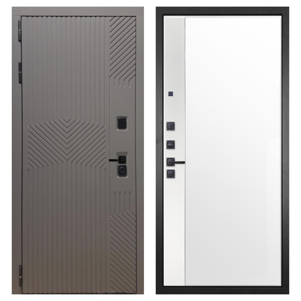Дизайн и отделка: Металлическая конструкция окрашена полимерно-порошковым покрытием цвета «Муар чёрный». Внешняя МДФ-панель и наличники выполнены в цвете «Смоки софт» толщиной 10 мм — современное сочетание фактуры и оттенка, создающее стильный внешний вид. Чёрная фурнитура подчёркивает лаконичный характер модели.