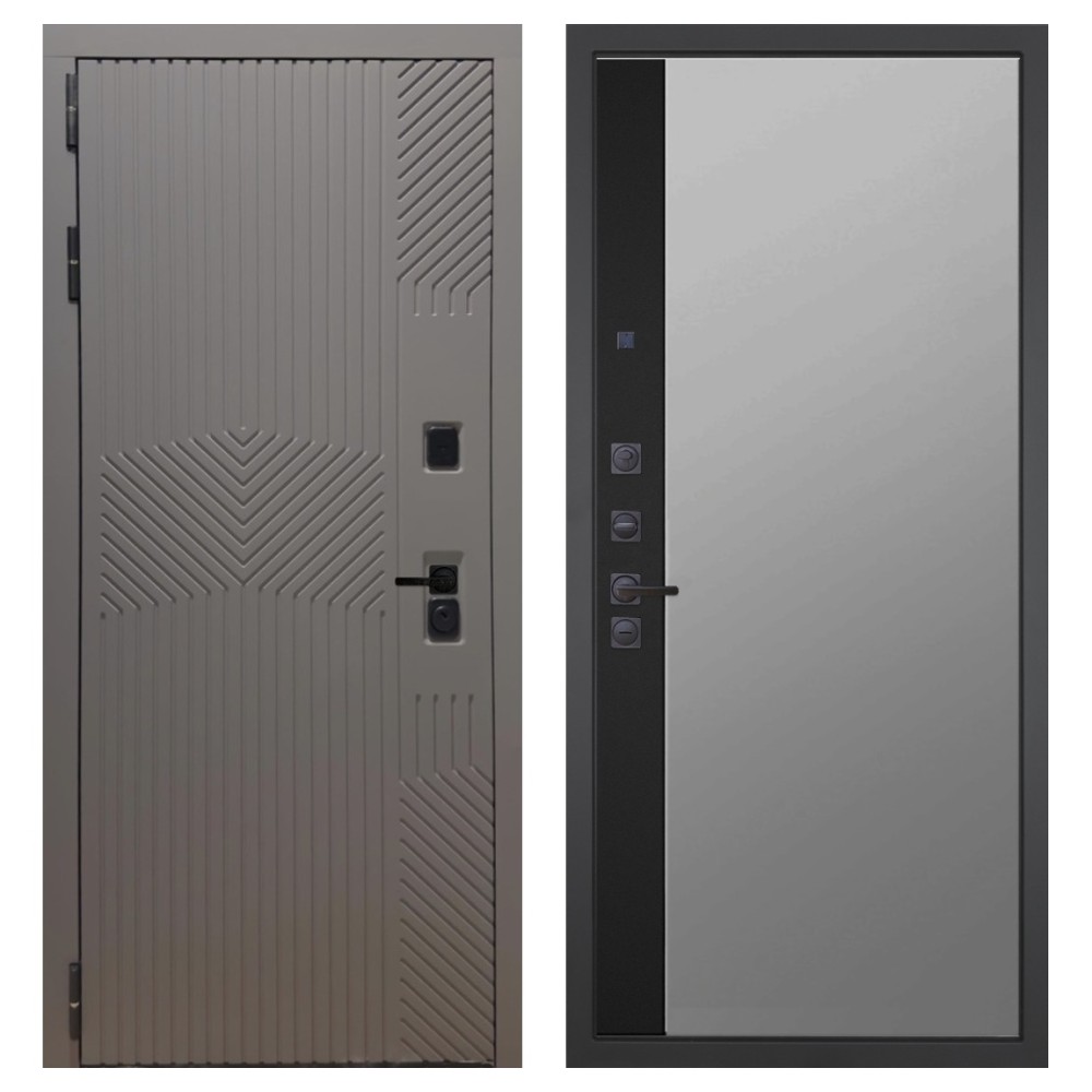 Дизайн и отделка: Металлическая конструкция окрашена полимерно-порошковым покрытием цвета «Муар чёрный». Внешняя МДФ-панель и наличники выполнены в цвете «Смоки софт» толщиной 10 мм — современное сочетание фактуры и оттенка, создающее стильный внешний вид. Чёрная фурнитура подчёркивает лаконичный характер модели.