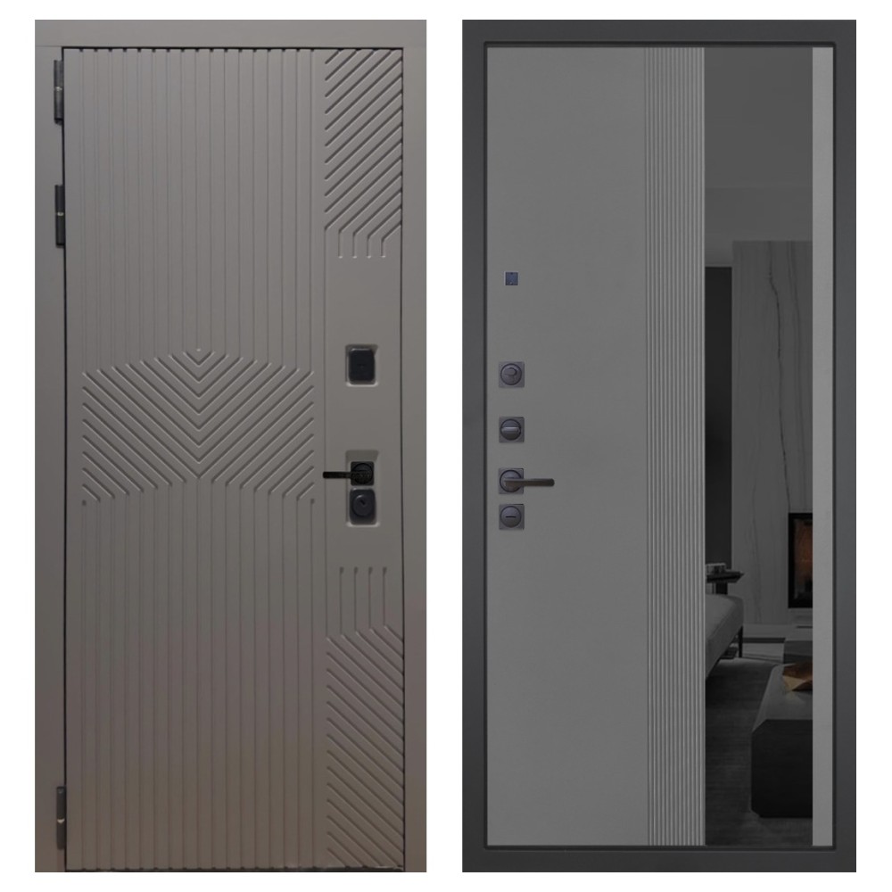 Дизайн и отделка: Металлическая конструкция окрашена полимерно-порошковым покрытием цвета «Муар чёрный». Внешняя МДФ-панель и наличники выполнены в цвете «Смоки софт» толщиной 10 мм — современное сочетание фактуры и оттенка, создающее стильный внешний вид. Чёрная фурнитура подчёркивает лаконичный характер модели.
