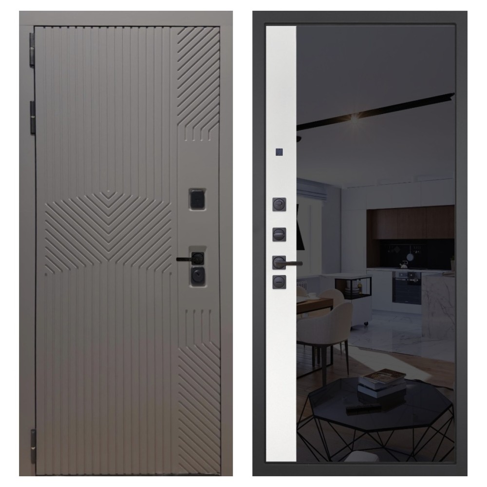Дизайн и отделка: Металлическая конструкция окрашена полимерно-порошковым покрытием цвета «Муар чёрный». Внешняя МДФ-панель и наличники выполнены в цвете «Смоки софт» толщиной 10 мм — современное сочетание фактуры и оттенка, создающее стильный внешний вид. Чёрная фурнитура подчёркивает лаконичный характер модели.