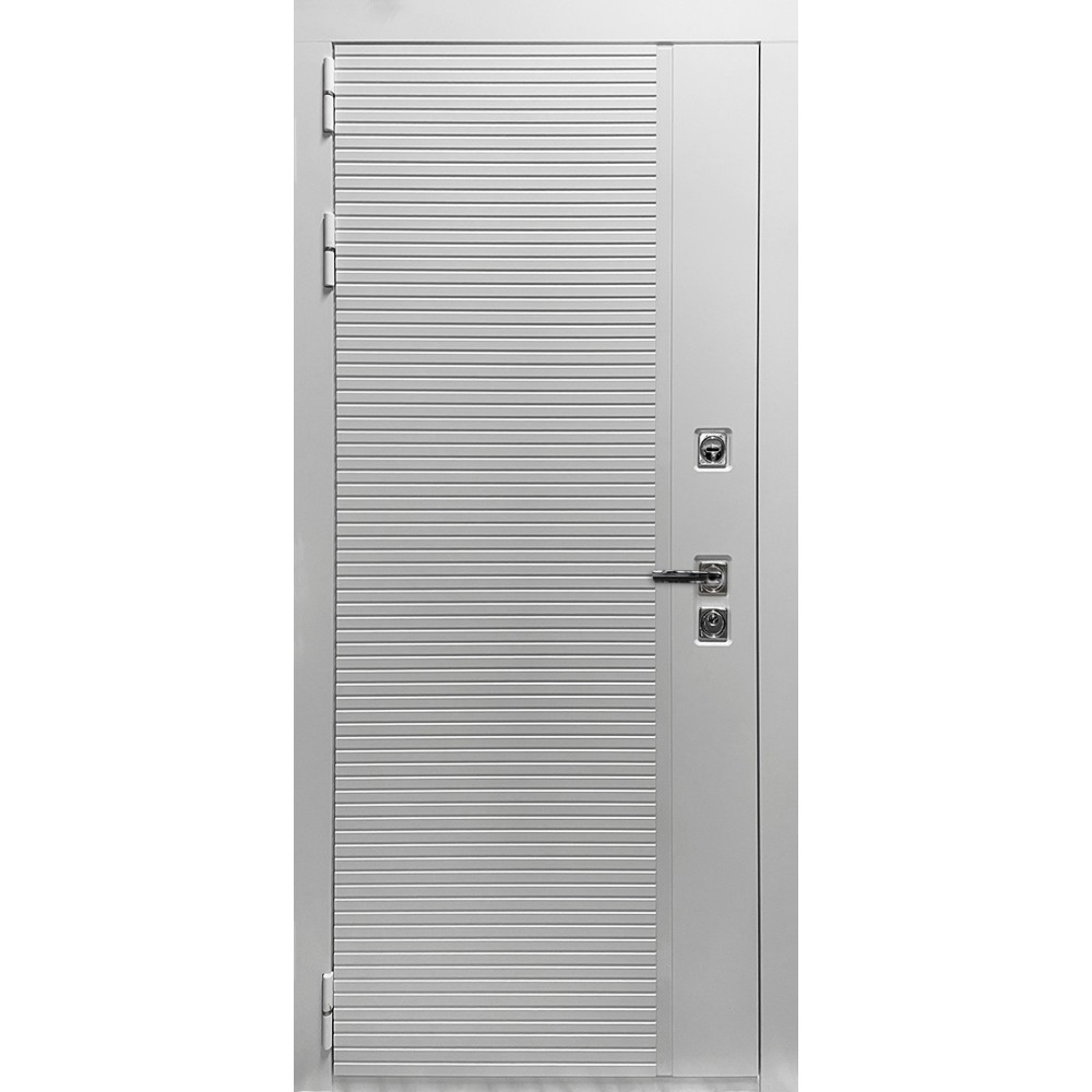 Дизайн и отделка: Полимерно-порошковое покрытие металлоконструкции выполнено в белом цвете — стойком, аккуратном и идеальном для квартиры. Внешняя МДФ-панель и наличники также белые, что создаёт единый гармоничный образ. Два объёмных хромированных логотипа придают модели фирменный стиль и аккуратность.