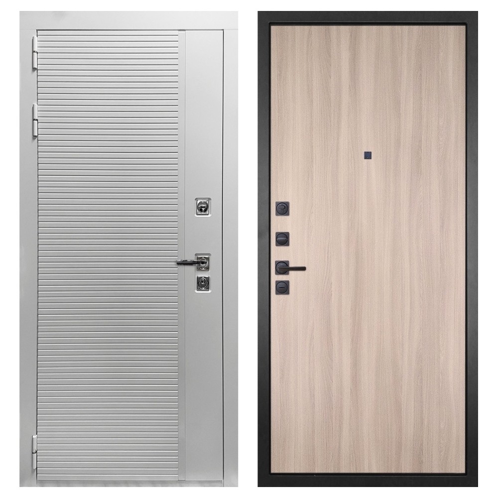 Дизайн и отделка: Полимерно-порошковое покрытие металлоконструкции выполнено в белом цвете — стойком, аккуратном и идеальном для квартиры. Внешняя МДФ-панель и наличники также белые, что создаёт единый гармоничный образ. Два объёмных хромированных логотипа придают модели фирменный стиль и аккуратность.