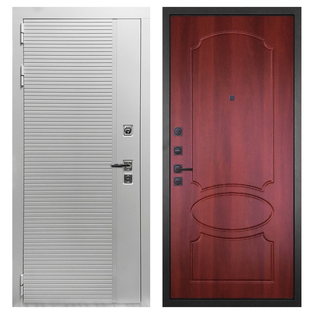 Дизайн и отделка: Полимерно-порошковое покрытие металлоконструкции выполнено в белом цвете — стойком, аккуратном и идеальном для квартиры. Внешняя МДФ-панель и наличники также белые, что создаёт единый гармоничный образ. Два объёмных хромированных логотипа придают модели фирменный стиль и аккуратность.