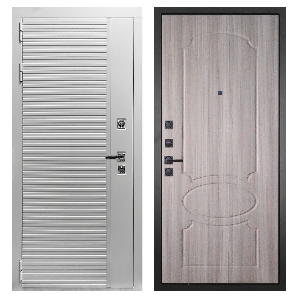 Дизайн и отделка: Полимерно-порошковое покрытие металлоконструкции выполнено в белом цвете — стойком, аккуратном и идеальном для квартиры. Внешняя МДФ-панель и наличники также белые, что создаёт единый гармоничный образ. Два объёмных хромированных логотипа придают модели фирменный стиль и аккуратность.