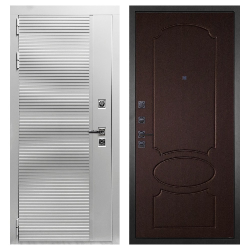 Дизайн и отделка: Полимерно-порошковое покрытие металлоконструкции выполнено в белом цвете — стойком, аккуратном и идеальном для квартиры. Внешняя МДФ-панель и наличники также белые, что создаёт единый гармоничный образ. Два объёмных хромированных логотипа придают модели фирменный стиль и аккуратность.