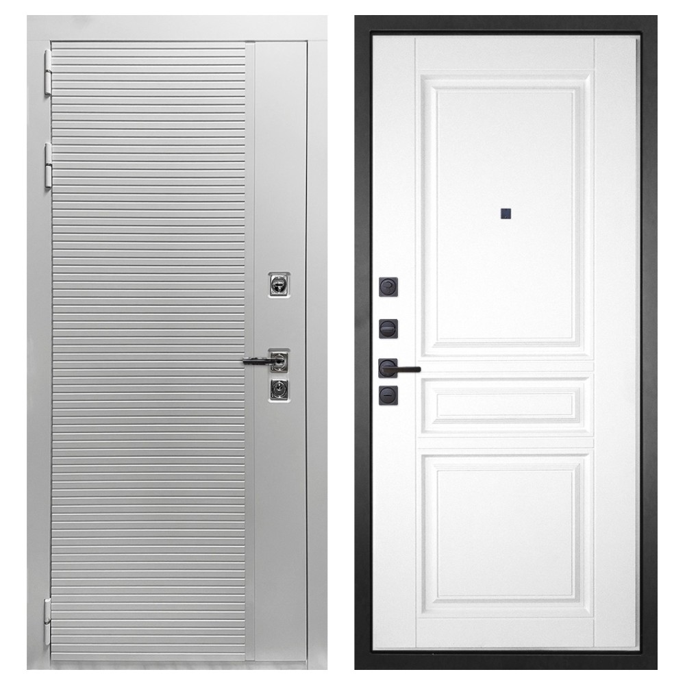 Дизайн и отделка: Полимерно-порошковое покрытие металлоконструкции выполнено в белом цвете — стойком, аккуратном и идеальном для квартиры. Внешняя МДФ-панель и наличники также белые, что создаёт единый гармоничный образ. Два объёмных хромированных логотипа придают модели фирменный стиль и аккуратность.