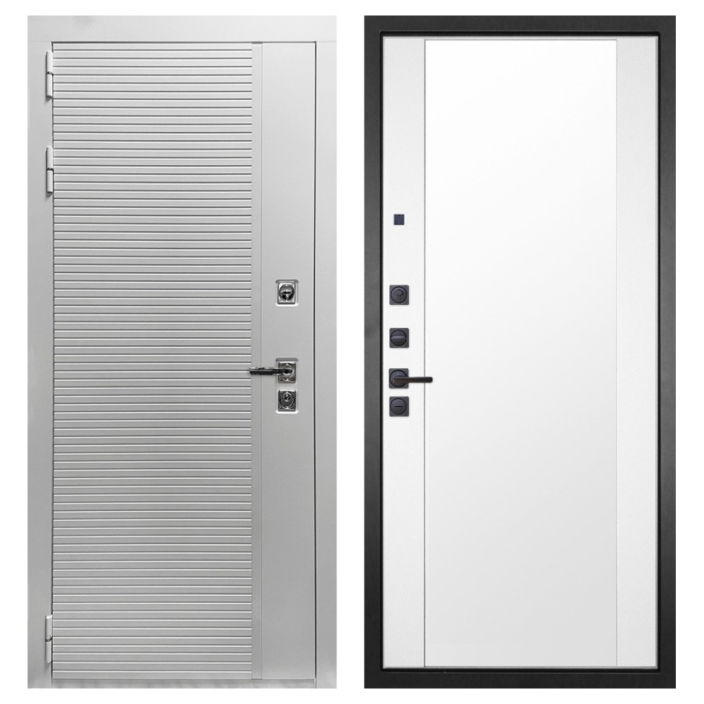 Дизайн и отделка: Полимерно-порошковое покрытие металлоконструкции выполнено в белом цвете — стойком, аккуратном и идеальном для квартиры. Внешняя МДФ-панель и наличники также белые, что создаёт единый гармоничный образ. Два объёмных хромированных логотипа придают модели фирменный стиль и аккуратность.