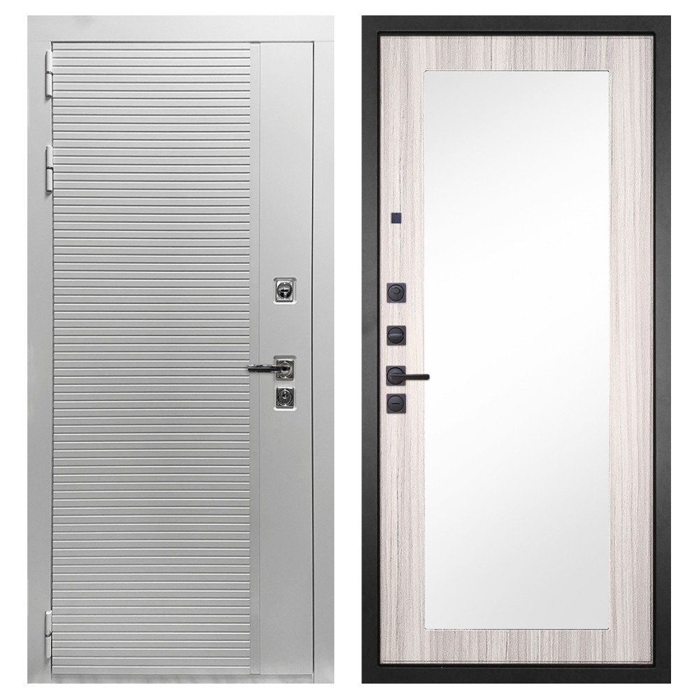 Дизайн и отделка: Полимерно-порошковое покрытие металлоконструкции выполнено в белом цвете — стойком, аккуратном и идеальном для квартиры. Внешняя МДФ-панель и наличники также белые, что создаёт единый гармоничный образ. Два объёмных хромированных логотипа придают модели фирменный стиль и аккуратность.