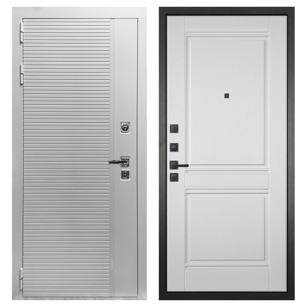 Дизайн и отделка: Полимерно-порошковое покрытие металлоконструкции выполнено в белом цвете — стойком, аккуратном и идеальном для квартиры. Внешняя МДФ-панель и наличники также белые, что создаёт единый гармоничный образ. Два объёмных хромированных логотипа придают модели фирменный стиль и аккуратность.