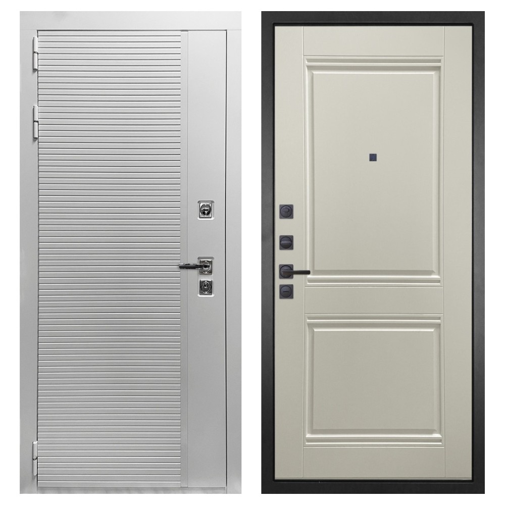 Дизайн и отделка: Полимерно-порошковое покрытие металлоконструкции выполнено в белом цвете — стойком, аккуратном и идеальном для квартиры. Внешняя МДФ-панель и наличники также белые, что создаёт единый гармоничный образ. Два объёмных хромированных логотипа придают модели фирменный стиль и аккуратность.