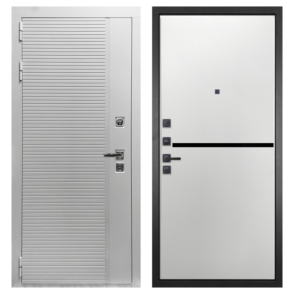 Дизайн и отделка: Полимерно-порошковое покрытие металлоконструкции выполнено в белом цвете — стойком, аккуратном и идеальном для квартиры. Внешняя МДФ-панель и наличники также белые, что создаёт единый гармоничный образ. Два объёмных хромированных логотипа придают модели фирменный стиль и аккуратность.