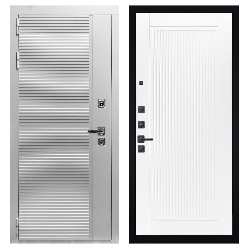 Дизайн и отделка: Полимерно-порошковое покрытие металлоконструкции выполнено в белом цвете — стойком, аккуратном и идеальном для квартиры. Внешняя МДФ-панель и наличники также белые, что создаёт единый гармоничный образ. Два объёмных хромированных логотипа придают модели фирменный стиль и аккуратность.