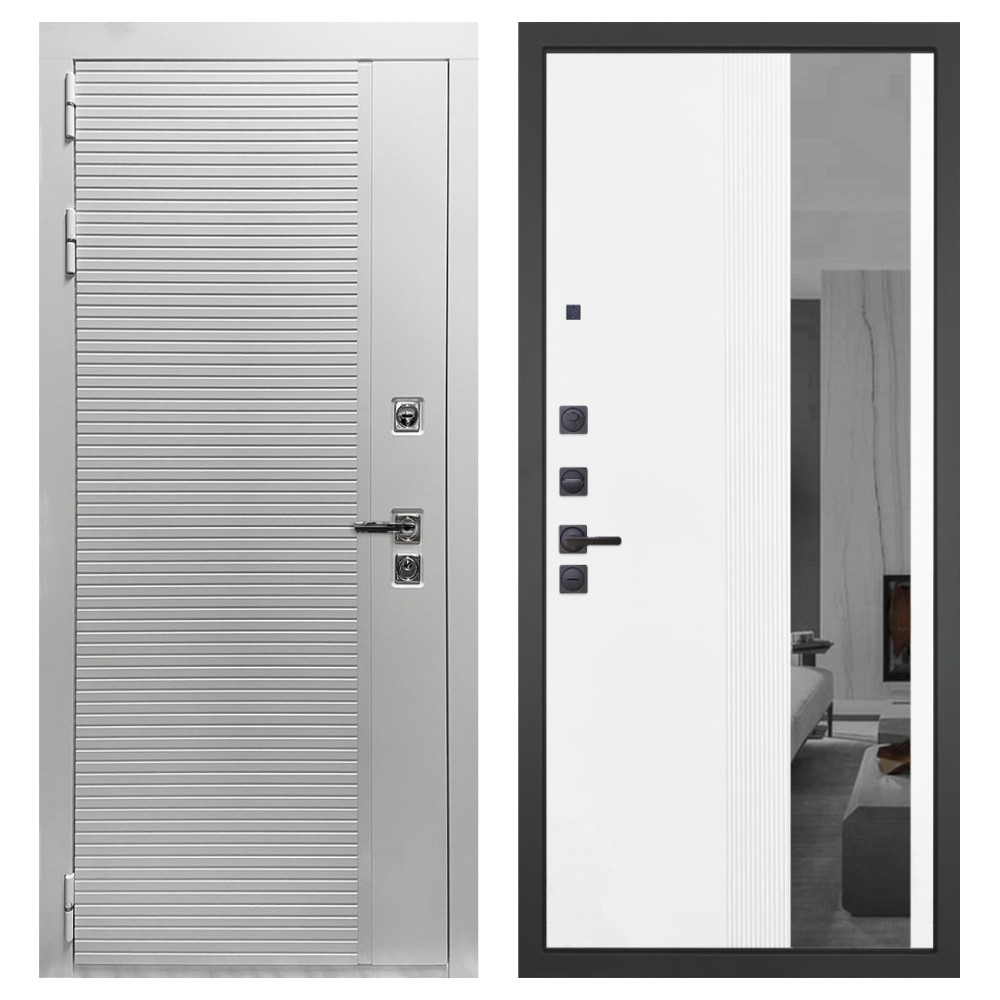 Дизайн и отделка: Полимерно-порошковое покрытие металлоконструкции выполнено в белом цвете — стойком, аккуратном и идеальном для квартиры. Внешняя МДФ-панель и наличники также белые, что создаёт единый гармоничный образ. Два объёмных хромированных логотипа придают модели фирменный стиль и аккуратность.