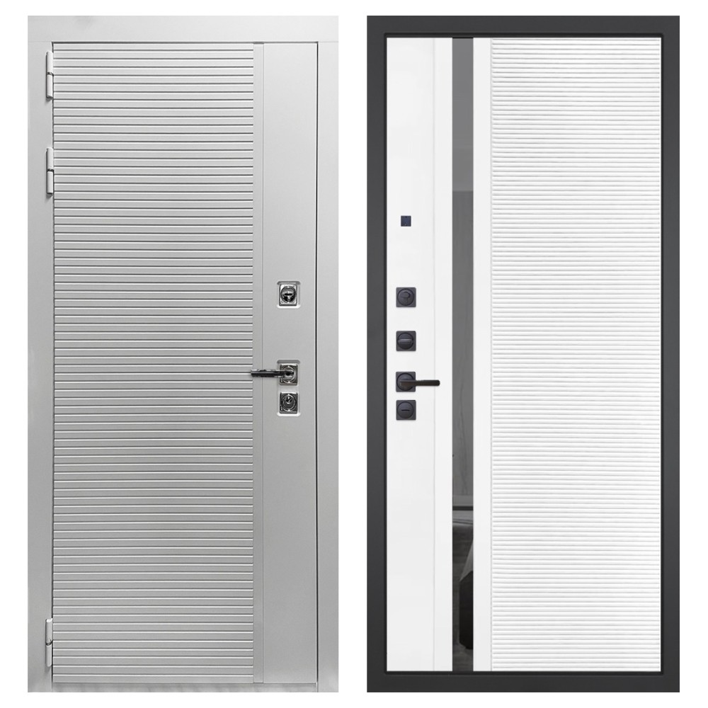 Дизайн и отделка: Полимерно-порошковое покрытие металлоконструкции выполнено в белом цвете — стойком, аккуратном и идеальном для квартиры. Внешняя МДФ-панель и наличники также белые, что создаёт единый гармоничный образ. Два объёмных хромированных логотипа придают модели фирменный стиль и аккуратность.