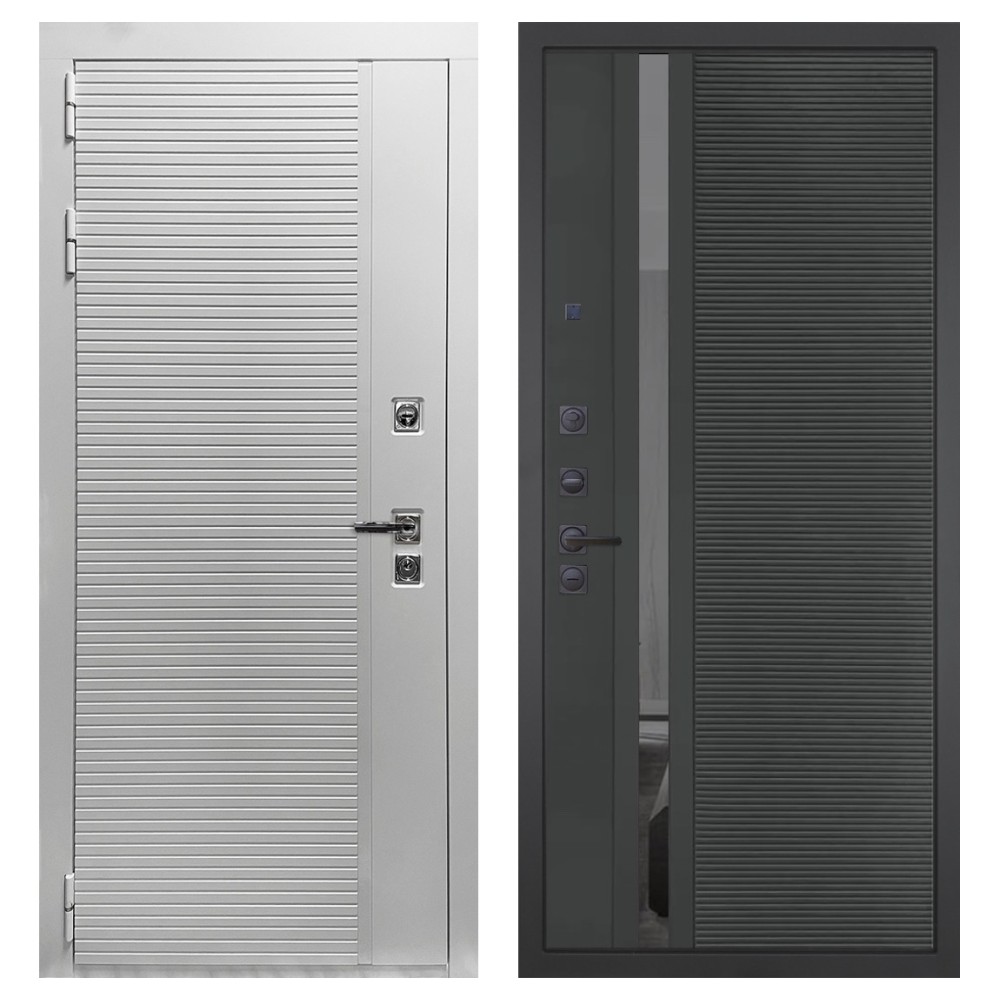 Дизайн и отделка: Полимерно-порошковое покрытие металлоконструкции выполнено в белом цвете — стойком, аккуратном и идеальном для квартиры. Внешняя МДФ-панель и наличники также белые, что создаёт единый гармоничный образ. Два объёмных хромированных логотипа придают модели фирменный стиль и аккуратность.