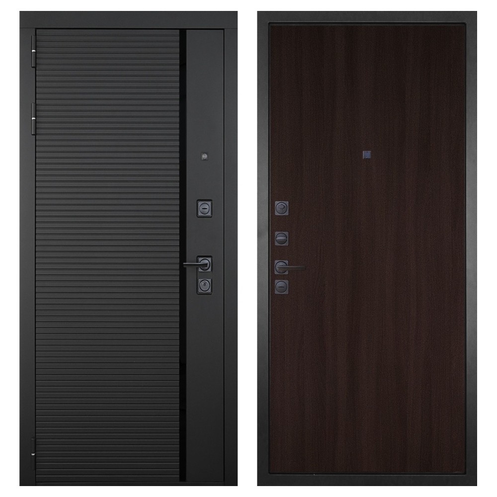 Дизайн и отделка: Металлическая конструкция выполнена в цвете «Муар чёрный» с прочным полимерно-порошковым покрытием, устойчивым к царапинам и коррозии. Внешняя МДФ-панель и наличники цвета «Чёрный графит» с декоративным чёрным стеклом придают двери строгий и современный облик. Два объёмных хромированных логотипа подчёркивают фирменный стиль и аккуратность исполнения.