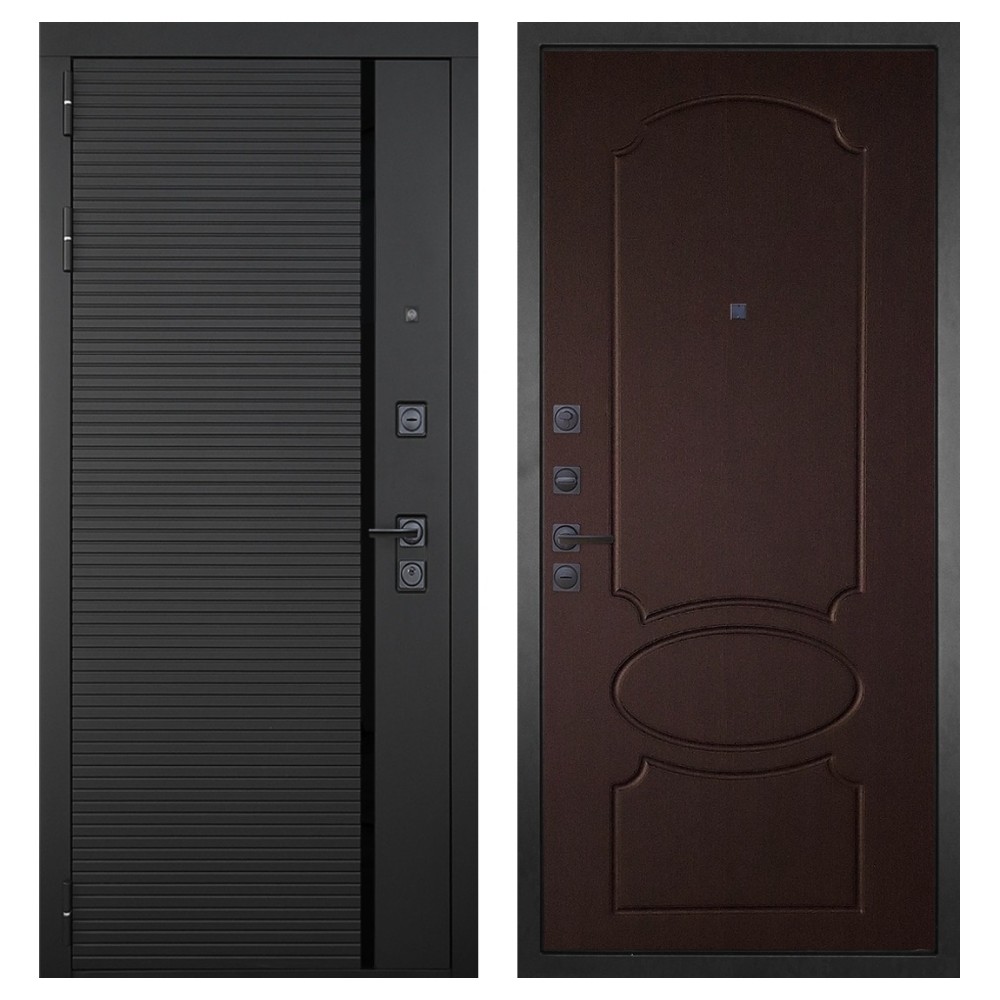 Дизайн и отделка: Металлическая конструкция выполнена в цвете «Муар чёрный» с прочным полимерно-порошковым покрытием, устойчивым к царапинам и коррозии. Внешняя МДФ-панель и наличники цвета «Чёрный графит» с декоративным чёрным стеклом придают двери строгий и современный облик. Два объёмных хромированных логотипа подчёркивают фирменный стиль и аккуратность исполнения.
