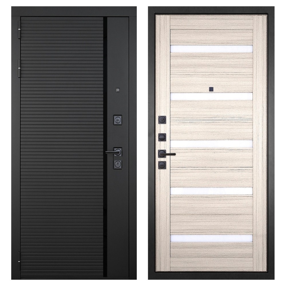 Дизайн и отделка: Металлическая конструкция выполнена в цвете «Муар чёрный» с прочным полимерно-порошковым покрытием, устойчивым к царапинам и коррозии. Внешняя МДФ-панель и наличники цвета «Чёрный графит» с декоративным чёрным стеклом придают двери строгий и современный облик. Два объёмных хромированных логотипа подчёркивают фирменный стиль и аккуратность исполнения.