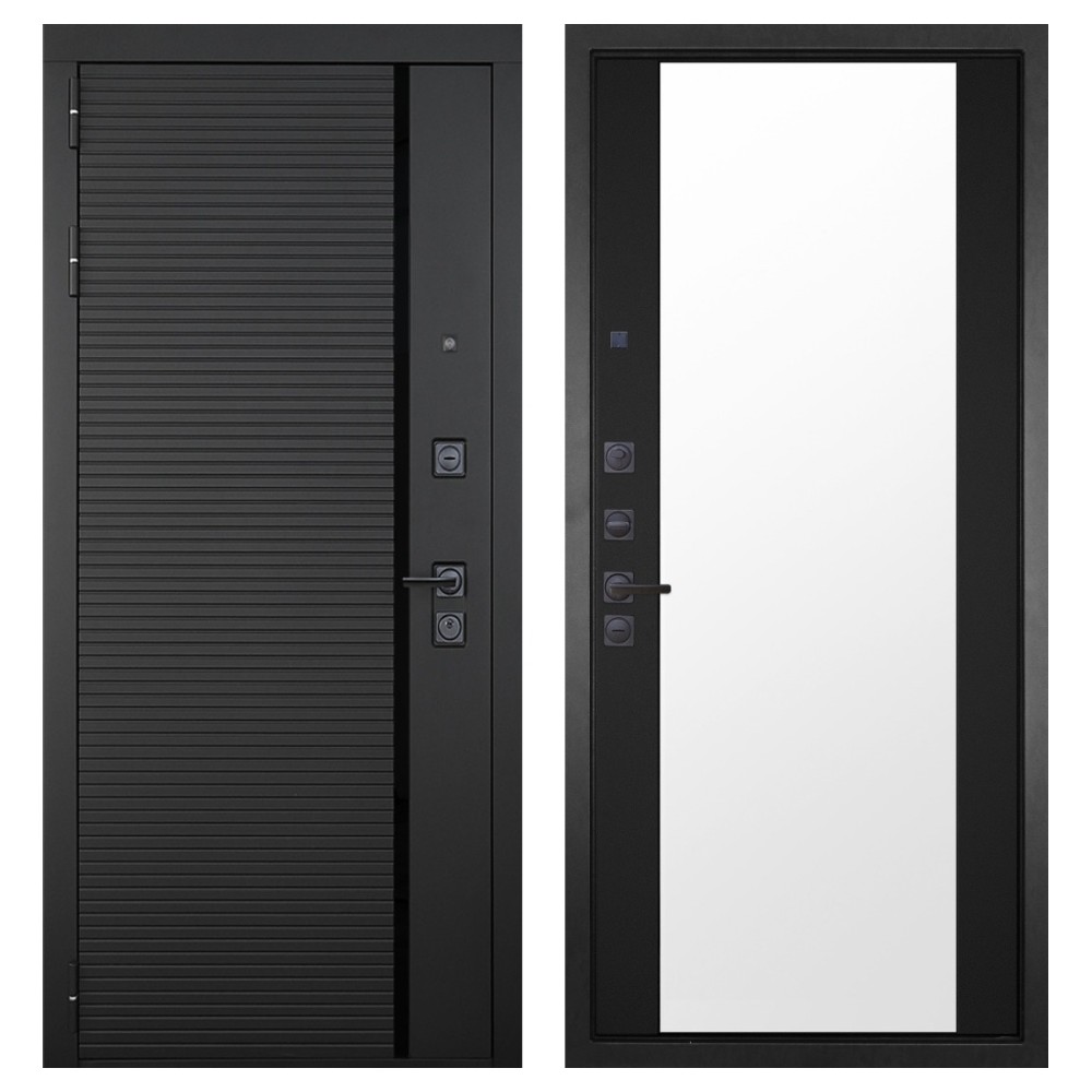 Дизайн и отделка: Металлическая конструкция выполнена в цвете «Муар чёрный» с прочным полимерно-порошковым покрытием, устойчивым к царапинам и коррозии. Внешняя МДФ-панель и наличники цвета «Чёрный графит» с декоративным чёрным стеклом придают двери строгий и современный облик. Два объёмных хромированных логотипа подчёркивают фирменный стиль и аккуратность исполнения.