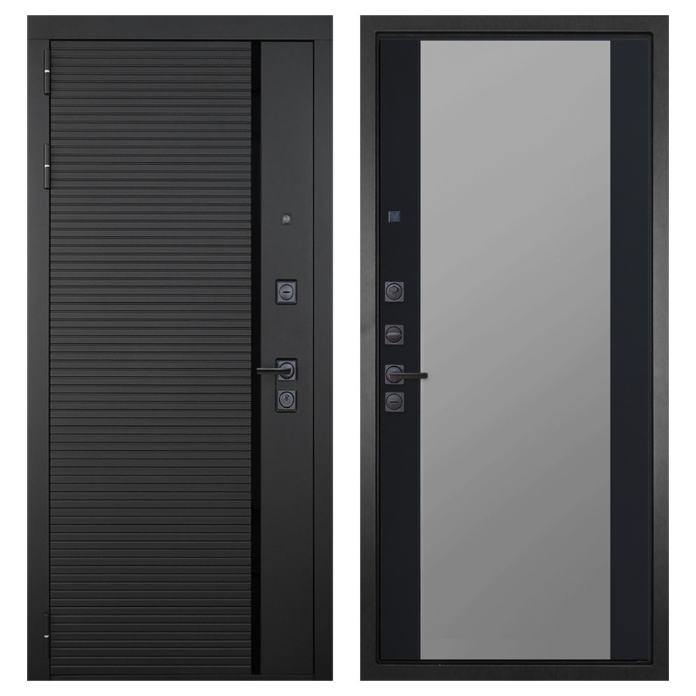 Дизайн и отделка: Металлическая конструкция выполнена в цвете «Муар чёрный» с прочным полимерно-порошковым покрытием, устойчивым к царапинам и коррозии. Внешняя МДФ-панель и наличники цвета «Чёрный графит» с декоративным чёрным стеклом придают двери строгий и современный облик. Два объёмных хромированных логотипа подчёркивают фирменный стиль и аккуратность исполнения.