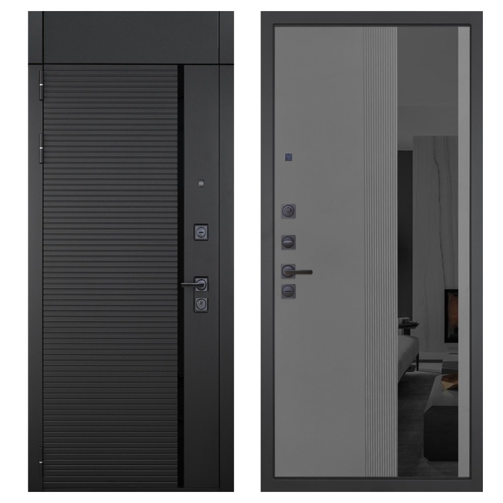 Гранит Пиано Черная с фрамугой, панель 086 Серый рельеф софт с тонированным зеркало 10 мм