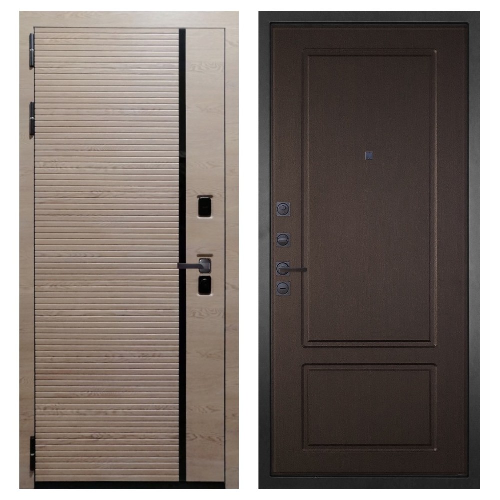 Дизайн и отделка: Металлическая конструкция покрыта износостойким полимерно-порошковым слоем. Внешняя МДФ-панель и наличники цвета «Ель поперечная» дополнены вставкой из чёрного стекла, создавая современный и выразительный облик. Два объёмных хромированных логотипа подчёркивают фирменный стиль и аккуратность исполнения.