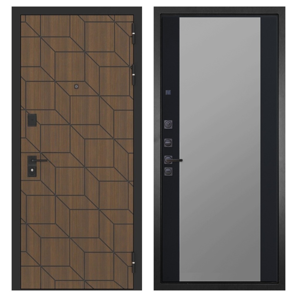 Дизайн и отделка: Металлическая конструкция окрашена полимерно-порошковым покрытием цвета «Муар чёрный». Внешняя фрезерованная МДФ-панель толщиной 10 мм выполнена в цвете «Ларче орех с чёрной патиной», создавая стильный контраст между металлом и древесной текстурой. Чёрная фурнитура подчёркивает современный и утончённый облик.