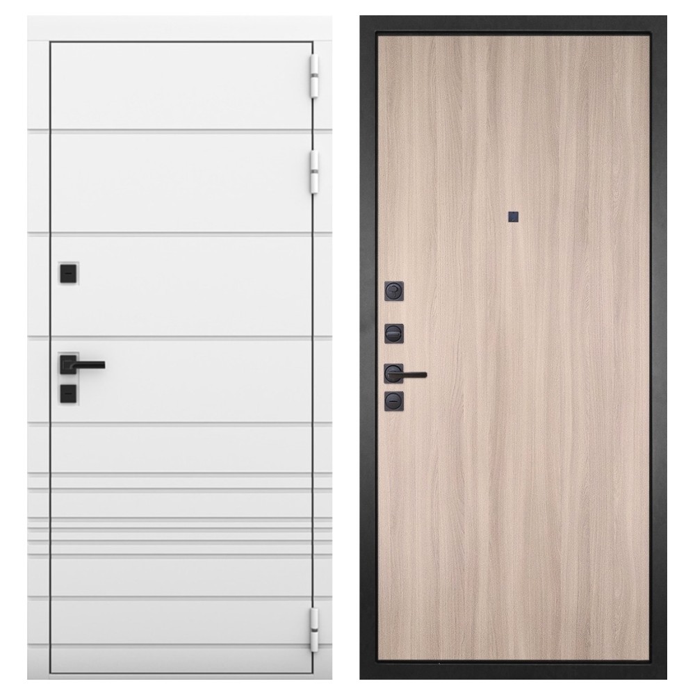 Функциональность и удобство: Чёрная фурнитура выгодно контрастирует с белой отделкой, создавая стильный акцент. Удлинённый глазок, усиленная ручка и качественные петли обеспечивают удобство повседневного использования.