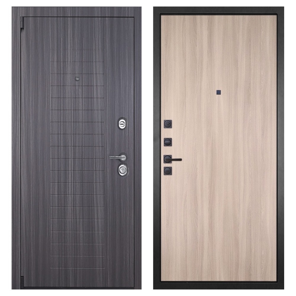 Дизайн и отделка: Металлическая конструкция покрыта полимерно-порошковым слоем цвета «Муар серый», устойчивым к повреждениям и влаге. Внешняя МДФ-панель и наличники цвета «Сандал серый» толщиной 16 мм создают элегантный и современный образ. Два объёмных хромированных логотипа подчёркивают фирменный стиль.