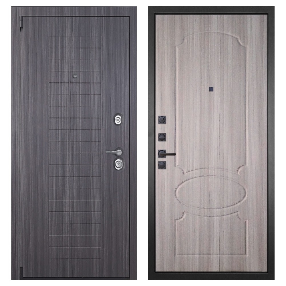 Дизайн и отделка: Металлическая конструкция покрыта полимерно-порошковым слоем цвета «Муар серый», устойчивым к повреждениям и влаге. Внешняя МДФ-панель и наличники цвета «Сандал серый» толщиной 16 мм создают элегантный и современный образ. Два объёмных хромированных логотипа подчёркивают фирменный стиль.