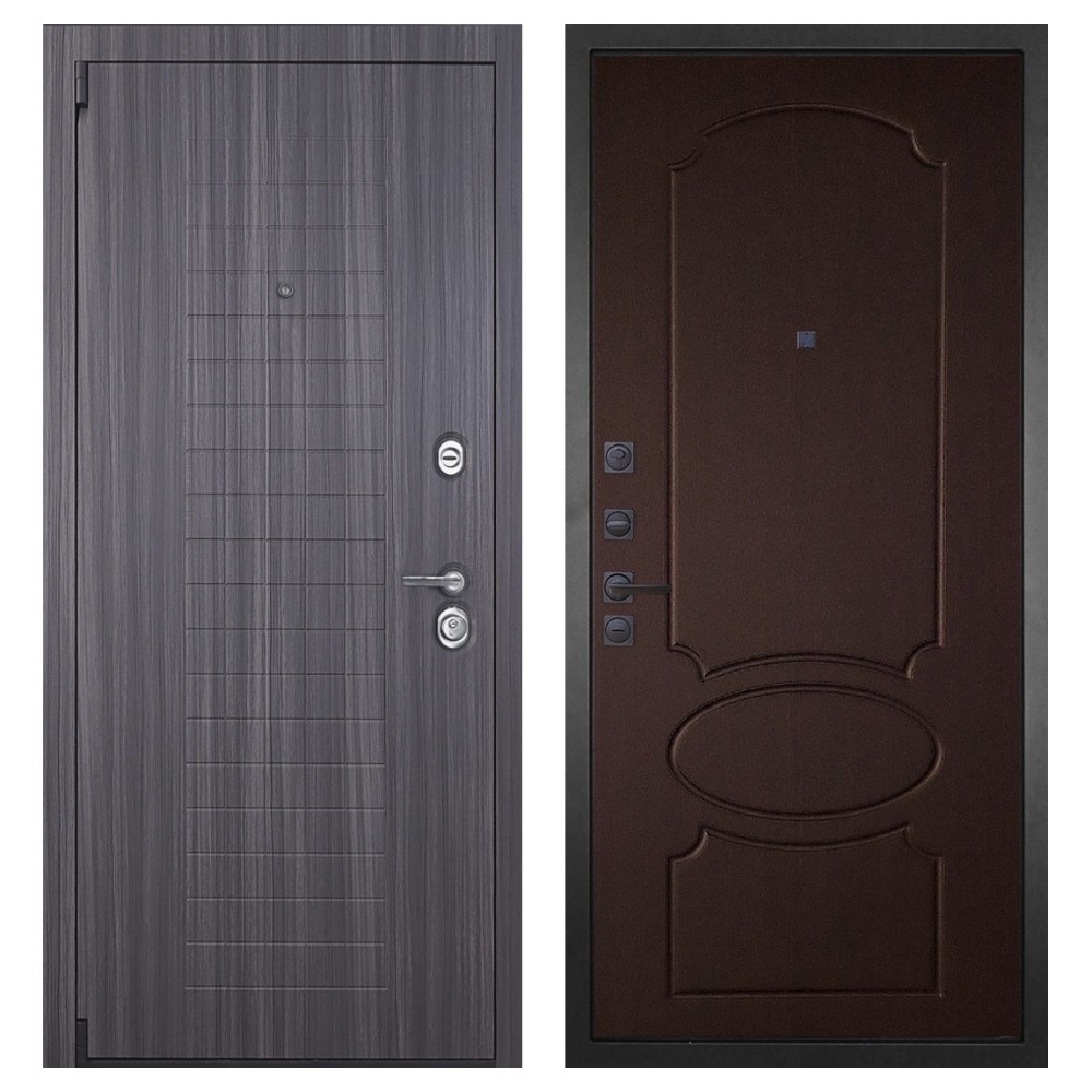 Дизайн и отделка: Металлическая конструкция покрыта полимерно-порошковым слоем цвета «Муар серый», устойчивым к повреждениям и влаге. Внешняя МДФ-панель и наличники цвета «Сандал серый» толщиной 16 мм создают элегантный и современный образ. Два объёмных хромированных логотипа подчёркивают фирменный стиль.