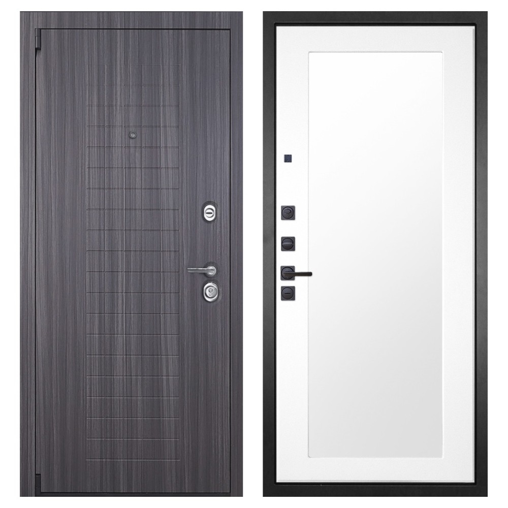 Дизайн и отделка: Металлическая конструкция покрыта полимерно-порошковым слоем цвета «Муар серый», устойчивым к повреждениям и влаге. Внешняя МДФ-панель и наличники цвета «Сандал серый» толщиной 16 мм создают элегантный и современный образ. Два объёмных хромированных логотипа подчёркивают фирменный стиль.