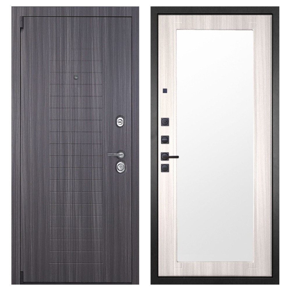 Дизайн и отделка: Металлическая конструкция покрыта полимерно-порошковым слоем цвета «Муар серый», устойчивым к повреждениям и влаге. Внешняя МДФ-панель и наличники цвета «Сандал серый» толщиной 16 мм создают элегантный и современный образ. Два объёмных хромированных логотипа подчёркивают фирменный стиль.