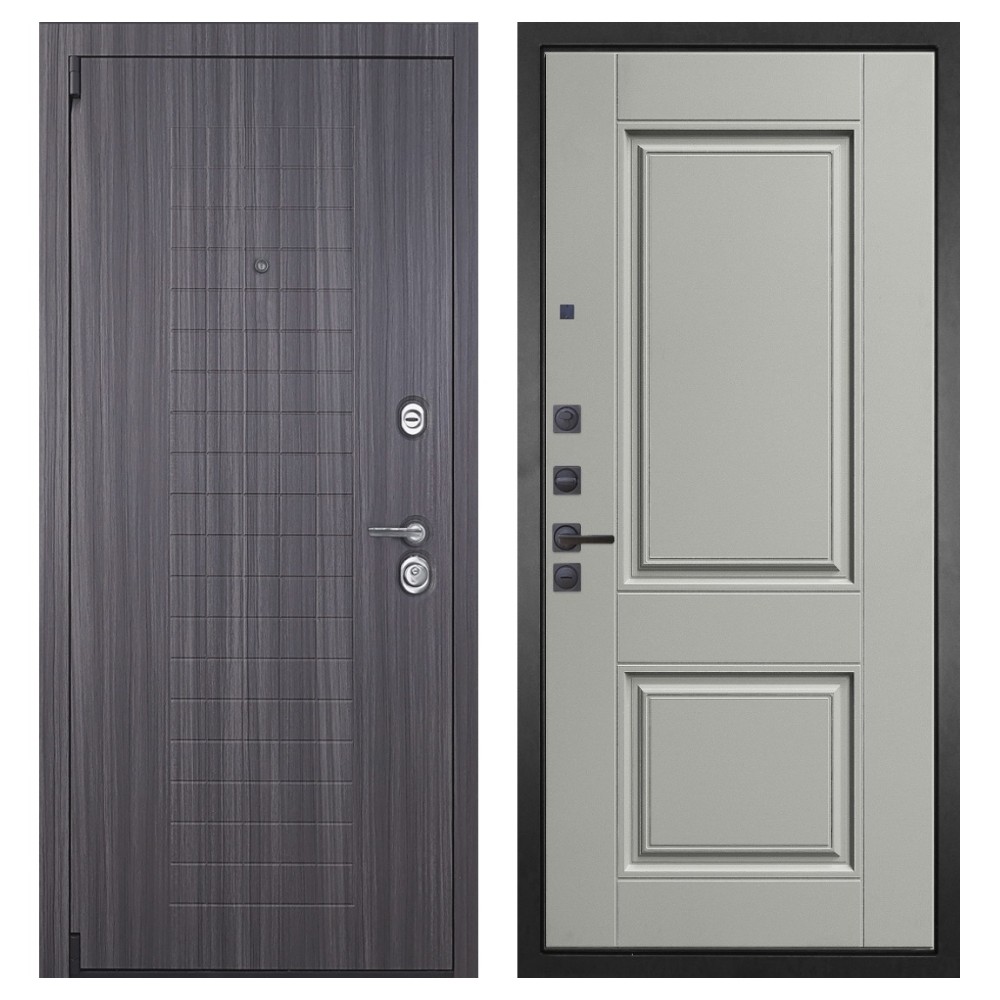 Дизайн и отделка: Металлическая конструкция покрыта полимерно-порошковым слоем цвета «Муар серый», устойчивым к повреждениям и влаге. Внешняя МДФ-панель и наличники цвета «Сандал серый» толщиной 16 мм создают элегантный и современный образ. Два объёмных хромированных логотипа подчёркивают фирменный стиль.