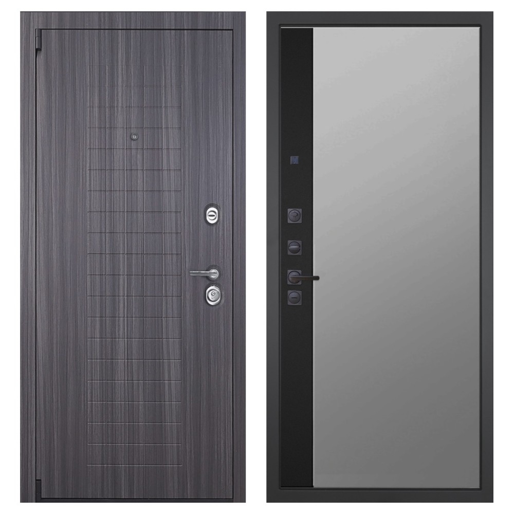 Дизайн и отделка: Металлическая конструкция покрыта полимерно-порошковым слоем цвета «Муар серый», устойчивым к повреждениям и влаге. Внешняя МДФ-панель и наличники цвета «Сандал серый» толщиной 16 мм создают элегантный и современный образ. Два объёмных хромированных логотипа подчёркивают фирменный стиль.