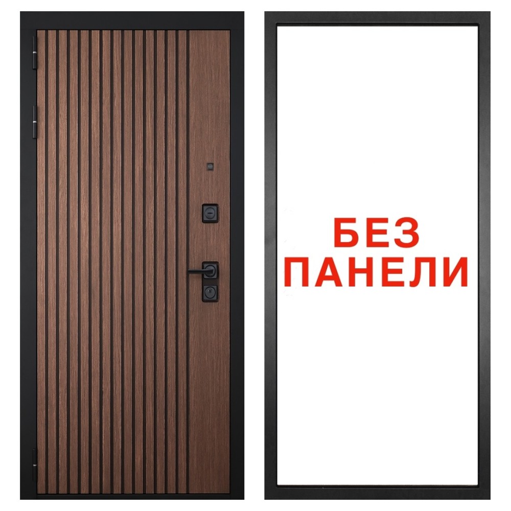 Дизайн и отделка: Металлическое полотно покрыто прочным полимерно-порошковым слоем цвета «Муар чёрный», устойчивым к износу и влаге. Внешняя МДФ-панель и наличники выполнены в цвете «Американский орех» с патиной, создавая благородный и тёплый внешний вид. Два объёмных хромированных логотипа подчеркивают фирменный стиль и премиальный уровень модели.