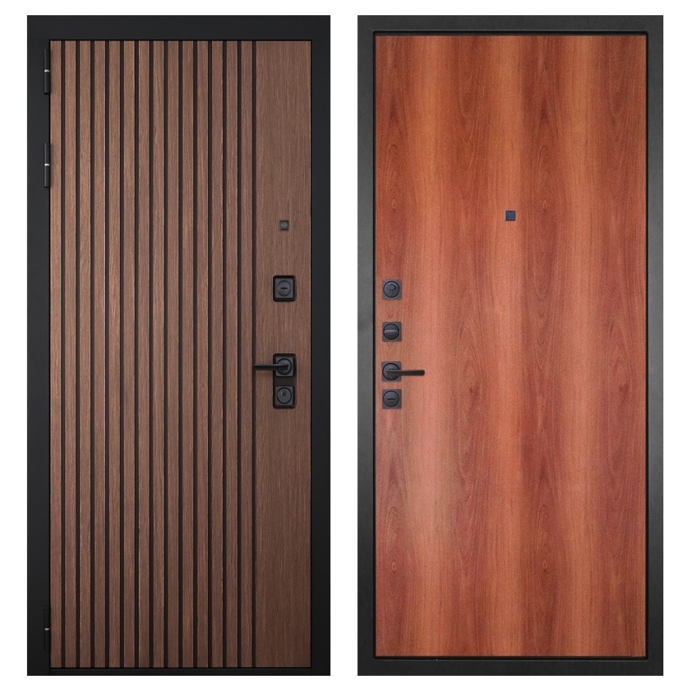 Дизайн и отделка: Металлическое полотно покрыто прочным полимерно-порошковым слоем цвета «Муар чёрный», устойчивым к износу и влаге. Внешняя МДФ-панель и наличники выполнены в цвете «Американский орех» с патиной, создавая благородный и тёплый внешний вид. Два объёмных хромированных логотипа подчеркивают фирменный стиль и премиальный уровень модели.