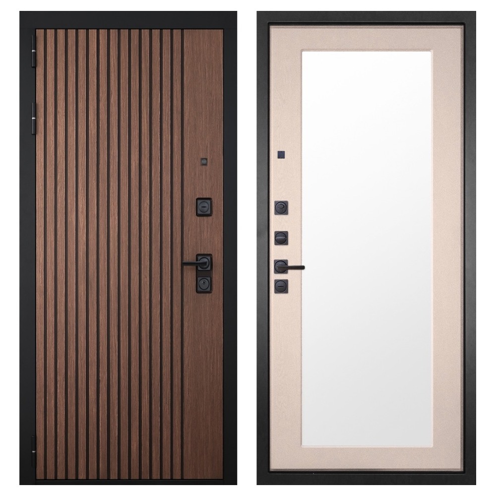 Дизайн и отделка: Металлическое полотно покрыто прочным полимерно-порошковым слоем цвета «Муар чёрный», устойчивым к износу и влаге. Внешняя МДФ-панель и наличники выполнены в цвете «Американский орех» с патиной, создавая благородный и тёплый внешний вид. Два объёмных хромированных логотипа подчеркивают фирменный стиль и премиальный уровень модели.