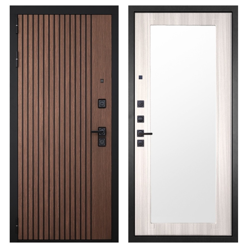 Дизайн и отделка: Металлическое полотно покрыто прочным полимерно-порошковым слоем цвета «Муар чёрный», устойчивым к износу и влаге. Внешняя МДФ-панель и наличники выполнены в цвете «Американский орех» с патиной, создавая благородный и тёплый внешний вид. Два объёмных хромированных логотипа подчеркивают фирменный стиль и премиальный уровень модели.