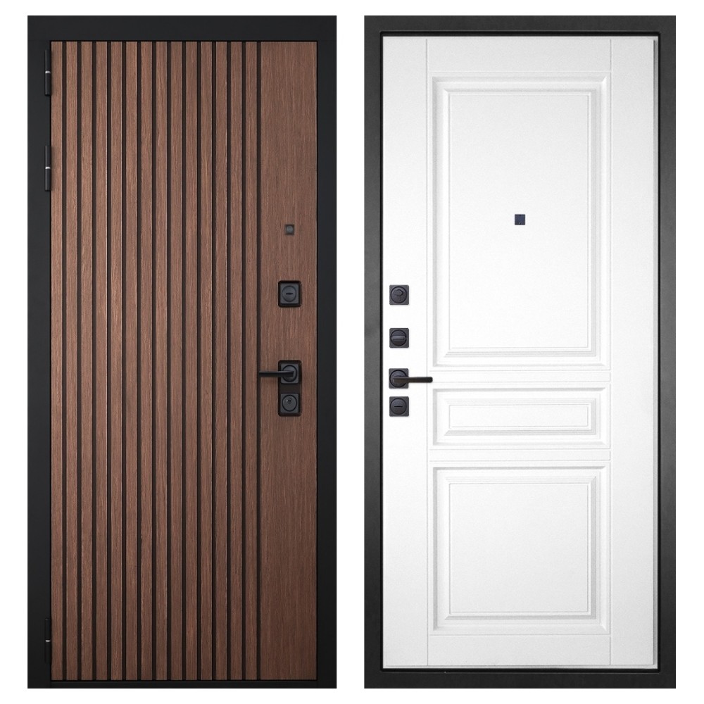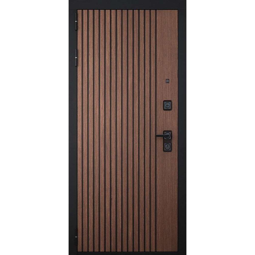 Дизайн и отделка: Металлическое полотно покрыто прочным полимерно-порошковым слоем цвета «Муар чёрный», устойчивым к износу и влаге. Внешняя МДФ-панель и наличники выполнены в цвете «Американский орех» с патиной, создавая благородный и тёплый внешний вид. Два объёмных хромированных логотипа подчеркивают фирменный стиль и премиальный уровень модели.