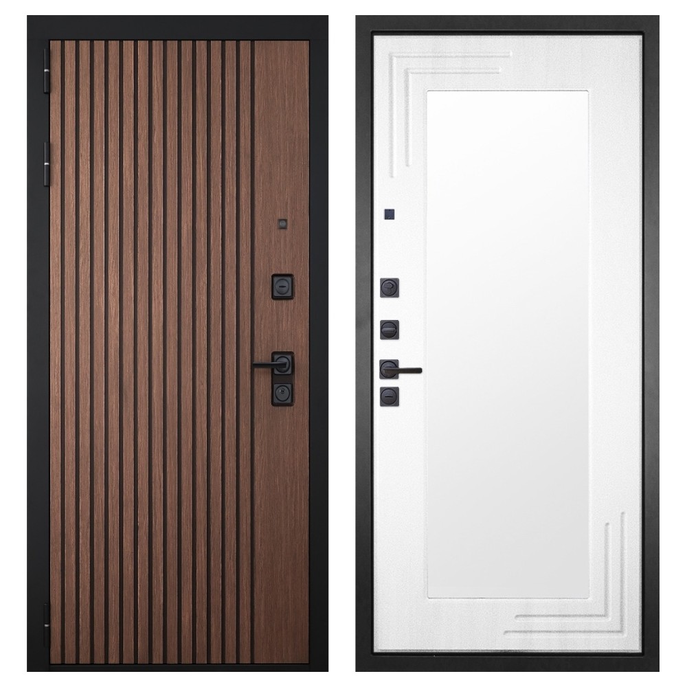Дизайн и отделка: Металлическое полотно покрыто прочным полимерно-порошковым слоем цвета «Муар чёрный», устойчивым к износу и влаге. Внешняя МДФ-панель и наличники выполнены в цвете «Американский орех» с патиной, создавая благородный и тёплый внешний вид. Два объёмных хромированных логотипа подчеркивают фирменный стиль и премиальный уровень модели.