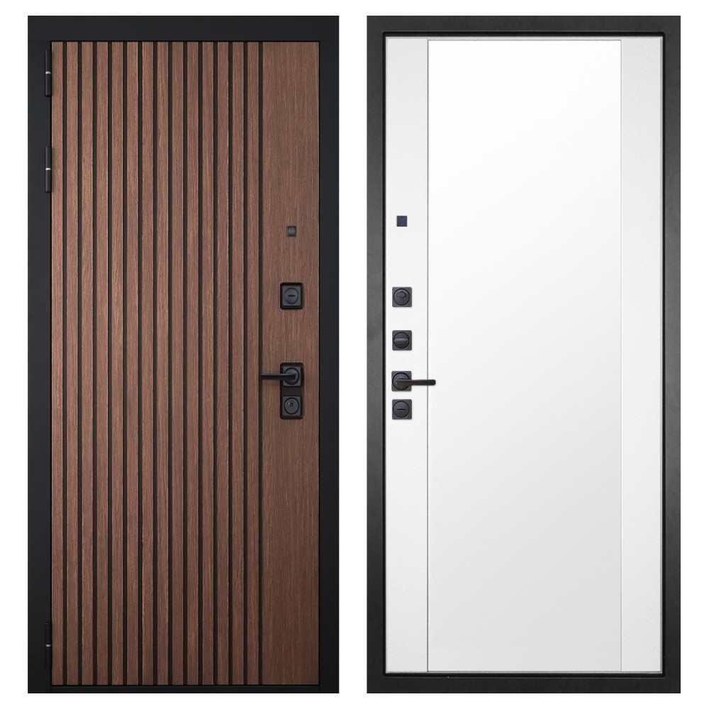 Дизайн и отделка: Металлическое полотно покрыто прочным полимерно-порошковым слоем цвета «Муар чёрный», устойчивым к износу и влаге. Внешняя МДФ-панель и наличники выполнены в цвете «Американский орех» с патиной, создавая благородный и тёплый внешний вид. Два объёмных хромированных логотипа подчеркивают фирменный стиль и премиальный уровень модели.