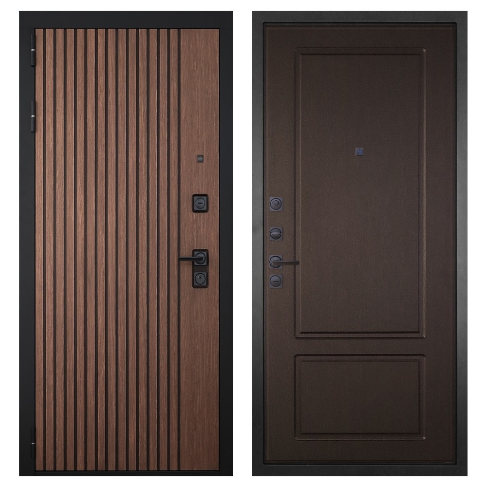 Дизайн и отделка: Металлическое полотно покрыто прочным полимерно-порошковым слоем цвета «Муар чёрный», устойчивым к износу и влаге. Внешняя МДФ-панель и наличники выполнены в цвете «Американский орех» с патиной, создавая благородный и тёплый внешний вид. Два объёмных хромированных логотипа подчеркивают фирменный стиль и премиальный уровень модели.