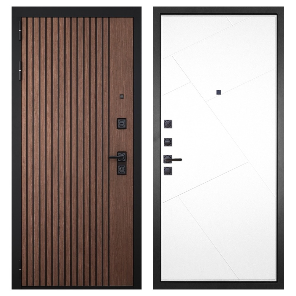 Дизайн и отделка: Металлическое полотно покрыто прочным полимерно-порошковым слоем цвета «Муар чёрный», устойчивым к износу и влаге. Внешняя МДФ-панель и наличники выполнены в цвете «Американский орех» с патиной, создавая благородный и тёплый внешний вид. Два объёмных хромированных логотипа подчеркивают фирменный стиль и премиальный уровень модели.