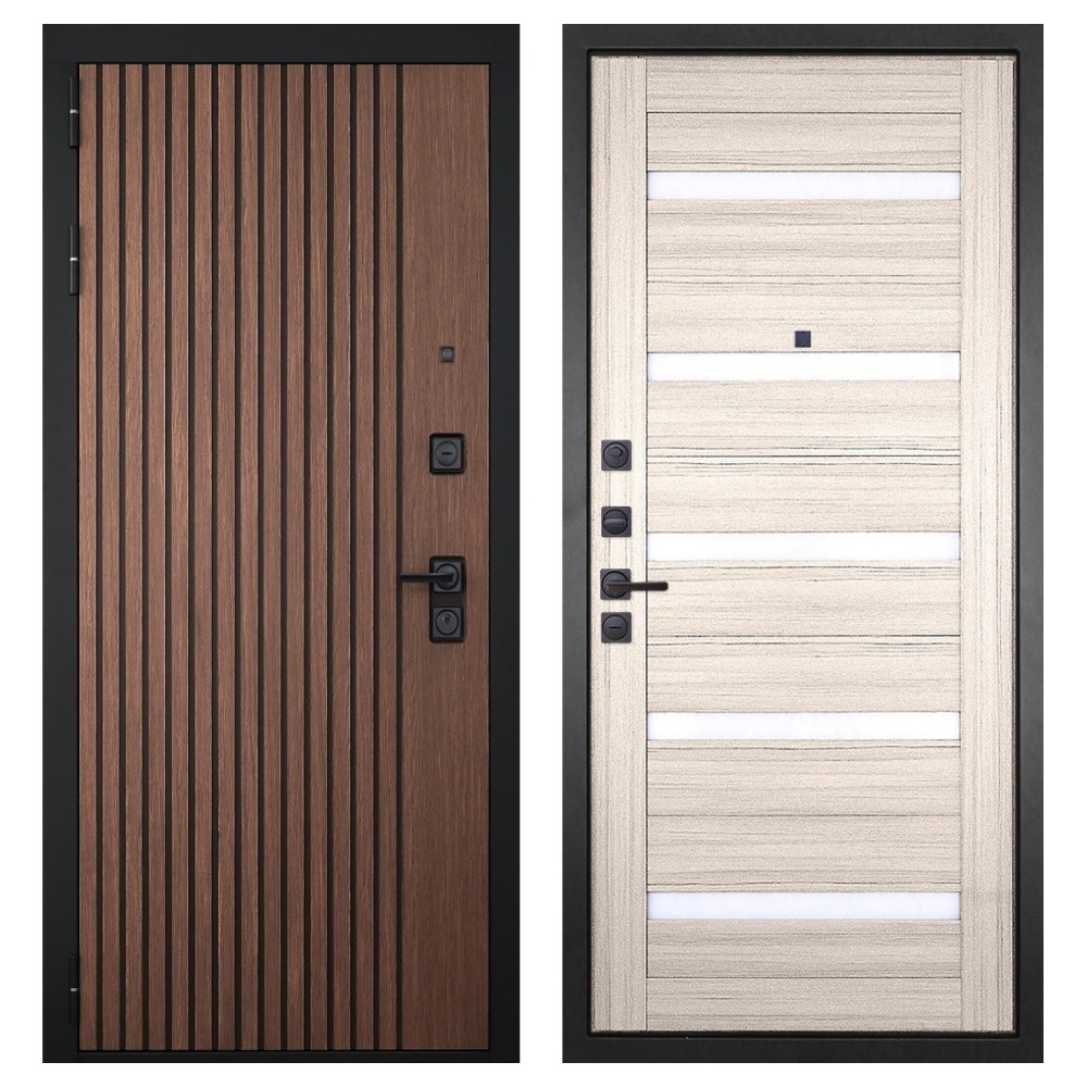 Дизайн и отделка: Металлическое полотно покрыто прочным полимерно-порошковым слоем цвета «Муар чёрный», устойчивым к износу и влаге. Внешняя МДФ-панель и наличники выполнены в цвете «Американский орех» с патиной, создавая благородный и тёплый внешний вид. Два объёмных хромированных логотипа подчеркивают фирменный стиль и премиальный уровень модели.