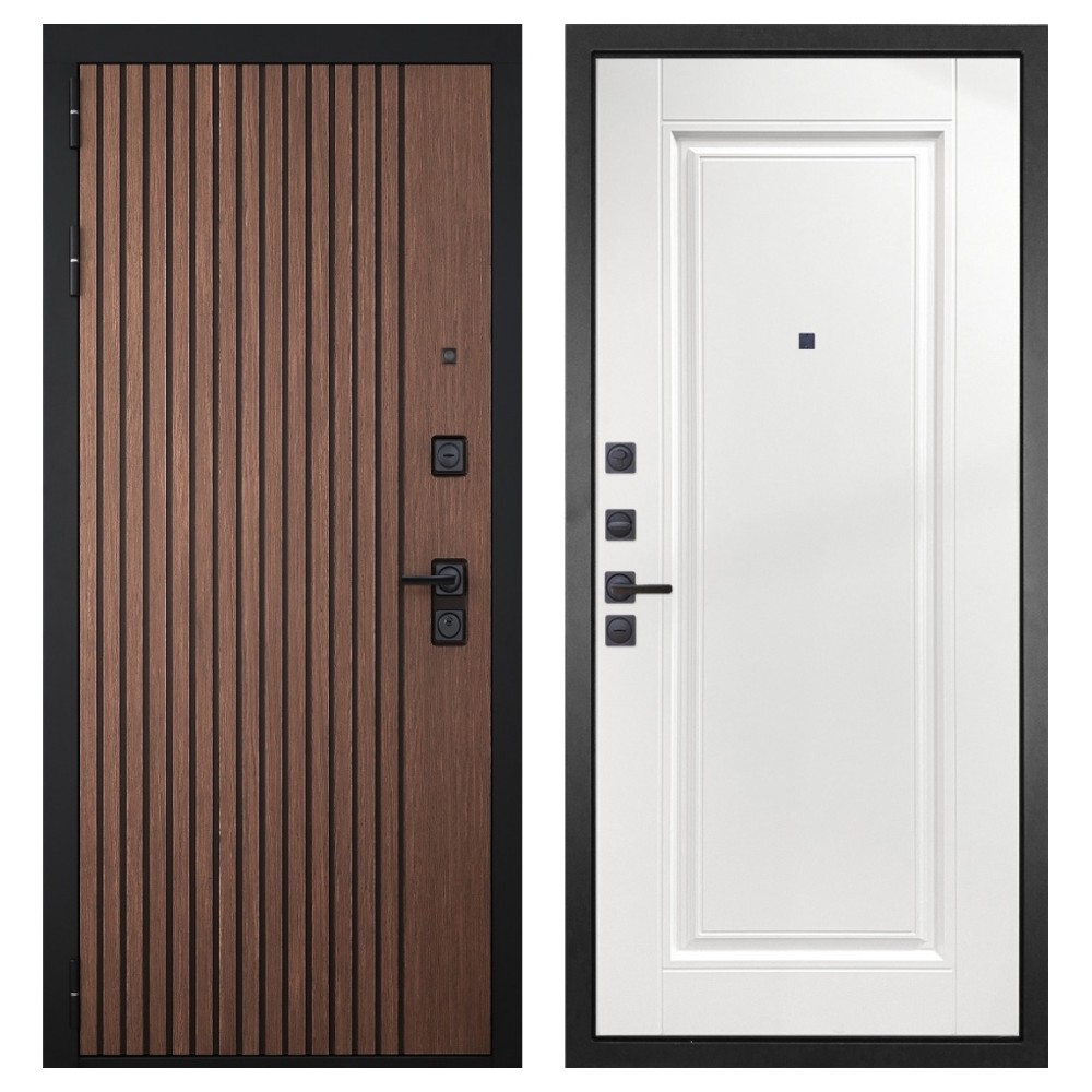 Дизайн и отделка: Металлическое полотно покрыто прочным полимерно-порошковым слоем цвета «Муар чёрный», устойчивым к износу и влаге. Внешняя МДФ-панель и наличники выполнены в цвете «Американский орех» с патиной, создавая благородный и тёплый внешний вид. Два объёмных хромированных логотипа подчеркивают фирменный стиль и премиальный уровень модели.