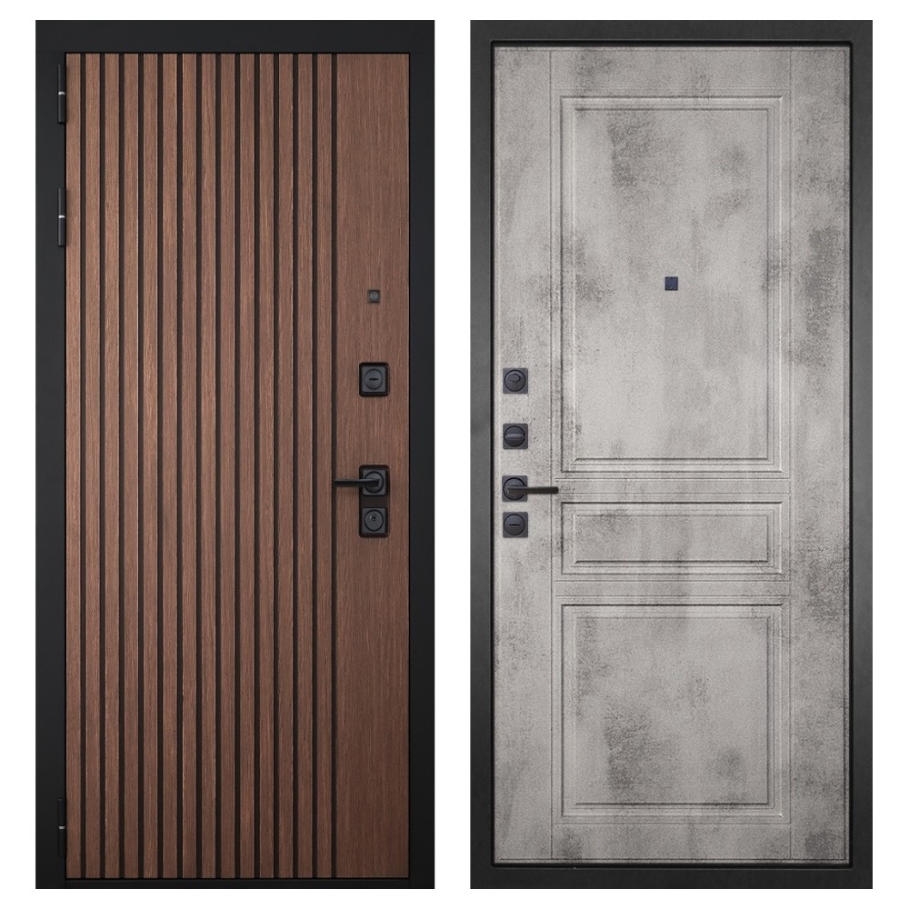 Дизайн и отделка: Металлическое полотно покрыто прочным полимерно-порошковым слоем цвета «Муар чёрный», устойчивым к износу и влаге. Внешняя МДФ-панель и наличники выполнены в цвете «Американский орех» с патиной, создавая благородный и тёплый внешний вид. Два объёмных хромированных логотипа подчеркивают фирменный стиль и премиальный уровень модели.