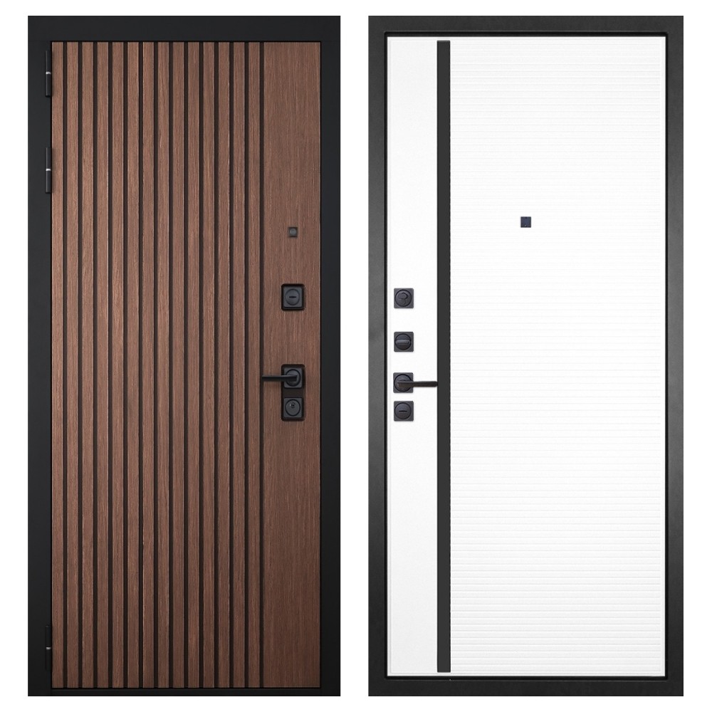 Дизайн и отделка: Металлическое полотно покрыто прочным полимерно-порошковым слоем цвета «Муар чёрный», устойчивым к износу и влаге. Внешняя МДФ-панель и наличники выполнены в цвете «Американский орех» с патиной, создавая благородный и тёплый внешний вид. Два объёмных хромированных логотипа подчеркивают фирменный стиль и премиальный уровень модели.